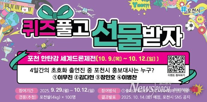 뉴스펀치 탁상훈 기자 | 포천시는 시민과의 소통 강화를 위해 10월 12일까지 '포천 한탄강 세계드론제전' 퀴즈 이벤트를 진행한다.