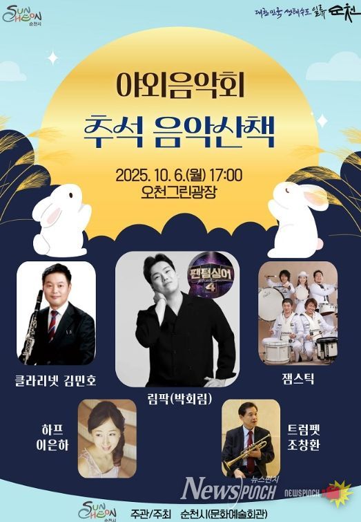 뉴스펀치 김길룡 기자 | 순천시 문화예술회관은 추석 명절을 맞아 시민과 관광객을 위한 야외음악회 '추석 음악산책'을 10월 6일 추석 당일 오후 5시에 오천그린광장에서 개최한다고 밝혔다.