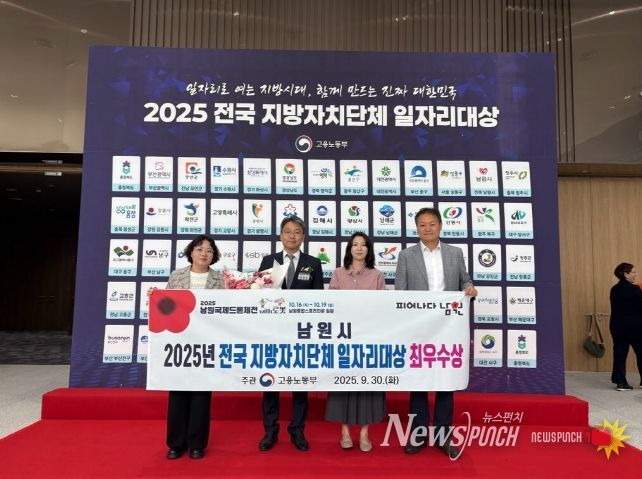 뉴스펀치 김길룡 기자 | 남원시는 9월 30일 고용노동부 주관으로 청주 오스코에서 열린 ‘2025년 전국 지방자치단체 일자리대상’에서 최우수상을 수상했다고 밝혔다.