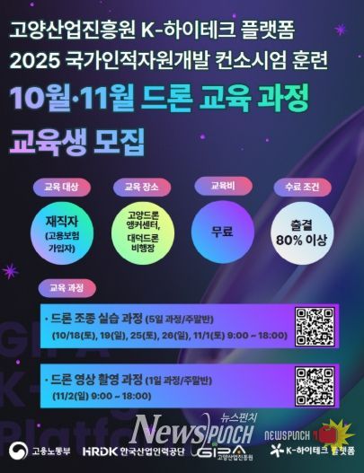 뉴스펀치 탁상훈 기자 | 고양산업진흥원 K-하이테크플랫폼지원단이 고용노동부와 한국산업인력공단이 주관하는 국가인적자원개발 컨소시엄 사업의 일환으로, 드론·생성형 AI 교육과정 교육생을 모집한다고 밝혔다.