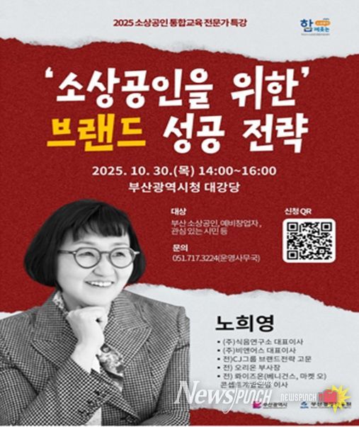 뉴스펀치 김길룡 기자 | 부산시는 오는 10월 30일 오후 2시 시청 대강당에서 개최되는 '2025년 하반기 소상공인 전문가 특강' 참가 접수를 오늘(1일)부터 시작한다고 밝혔다.