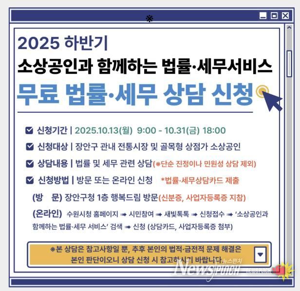 뉴스펀치 탁상훈 기자 | 수원시 장안구는 오는 10월 13일부터 법률·세무 상담을 받기 어려운 관내 전통시장 및 골목형 상점가 소상공인을 대상으로 쉽고 편리하게 상의할 수 있는 무료 상담인 ‘소상공인과 함께하는 법률·세무 서비스’ 사업을 운영한다.