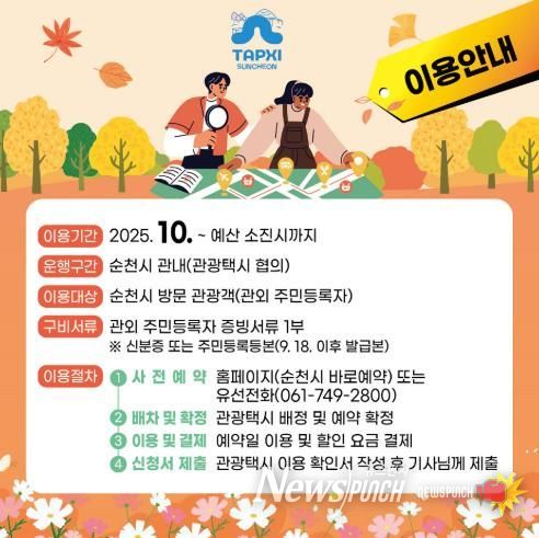 뉴스펀치 김길룡 기자 | 순천시는 10월부터 순천 관광택시 ‘가을맞이 반값 할인 이벤트’를 진행한다고 밝혔다.
