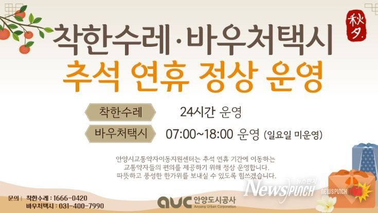 뉴스펀치 탁상훈 기자 | 안양시가 오는 추석 연휴 기간(10.3.~10.9.)에 교통약자의 이동권 보장을 위한 특별교통수단 이동지원서비스 ‘착한수레’와 ‘바우처택시’를 정상 운행한다고 1일 밝혔다.