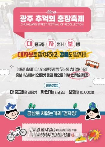 뉴스펀치 김길룡 기자 | 광주 동구는 오는 15일부터 5일간 금남로와 충장로 일원에서 열리는 제22회 광주 추억의 충장축제에서 ‘금남로 차 없는 거리’의 가치를 알리고 대자보 도시 정책에 시민 참여를 확대하기 위한 특별 홍보 이벤트를 진행한다고 밝혔다.