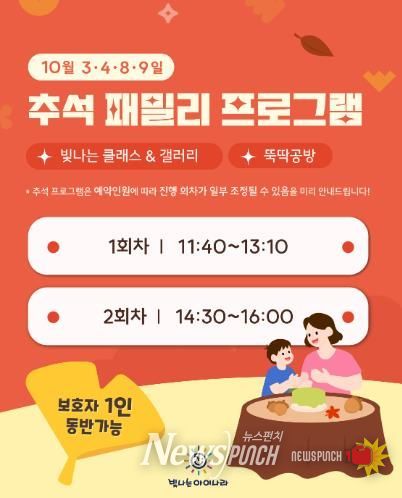 연휴 특별 가족 프로그램은 ‘가을 단풍 숲 작은 음악회’를 주제로 3·4·8·9일 진행하며 ▲빛나는 클래스&빛의 갤러리 ▲동화공작소 ▲뚝딱공방 ▲물감공방 등을 체험할 수 있다.