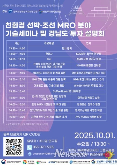 뉴스펀치 김길룡 기자 | 경상남도는 10월 1일 창원 그랜드머큐어앰버서더 그랜드볼룸에서 ‘친환경 선박·조선 MRO 분야 투자유치 설명회’를 개최했다.