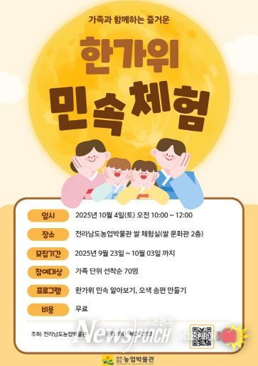 뉴스펀치 김길룡 기자 | 전라남도 농업박물관은 다가오는 한가위를 맞아 가족 단위 관람객 대상으로 ‘한가위 민속 체험행사’를 10월 4일에 개최한다고 밝혔다.