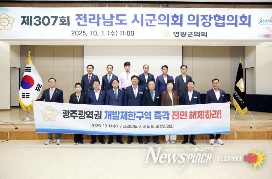 뉴스펀치 이현승 기자 | 전라남도 시군 의회 의장협의회는 지난 10월 1일 영광군의회에서 개최된 제307회 정례회의에서“광주광역권 개발제한구역 전면 해제 촉구 건의안”을 만장일치로 채택했다.