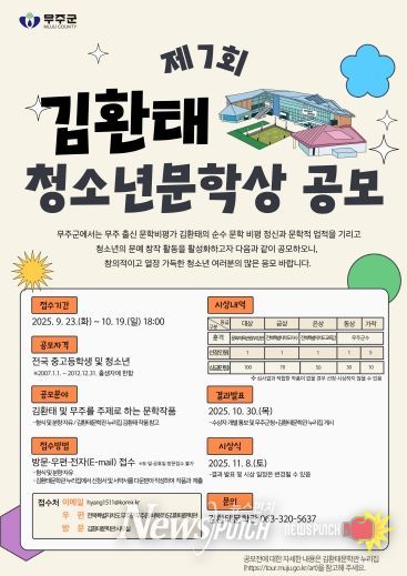 뉴스펀치 김길룡 기자 | 무주군이 전국의 중·고등학생 및 청소년(2007.1.1.~2012.12.31. 출생자에 한함)을 대상으로 제7회 김환태 청소년문학상에 도전하는 작품 공모에 나섰다.