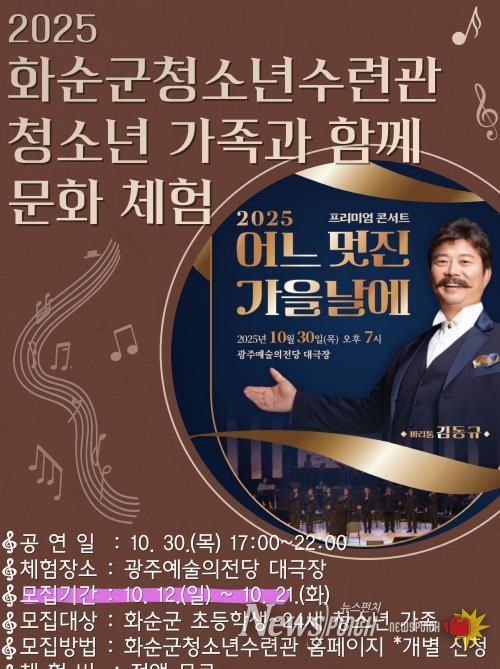 뉴스펀치 김길룡 기자 | 화순군은 2일 청소년수련관에서 짙어가는 가을의 정취 속에 청소년과 가족이 함께하는 특별한 문화체험, 바리톤 김동규의 프리미엄 콘서트'어느 멋진 가을날'을 관람할 청소년 가족 60명을 선착순 모집한다고 밝혔다.