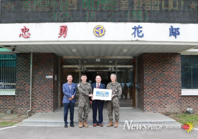 뉴스펀치 김길룡 기자 | 옥천군 통합방위협의회가 2일 육군 제111보병여단과 제2201부대 1대대를 찾아 지역방위를 위해 고향을 찾지 못하는 군 장병과 일일이 악수를 나누며 격려하고 군 장병들에게 감사의 마음을 전했다.