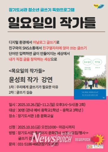 뉴스펀치 탁상훈 기자 | 김포시 장기도서관은 청소년 글쓰기 특화프로그램으로 '일요일의 작가들'을 오는 10월 26일, 11월 2일 오후 3시부터 5시까지 장기도서관 1층 문화교실에서 운영한다고 밝혔다
