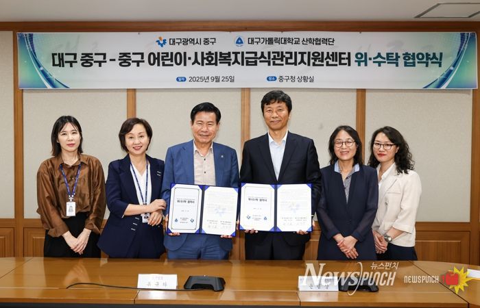 뉴스펀치 조평훈 기자 | 대구 중구는 지난달 25일 대구가톨릭대학교 산학협력단과 ‘중구 어린이·사회복지 급식관리지원센터 위탁 운영’ 협약을 체결했다.
