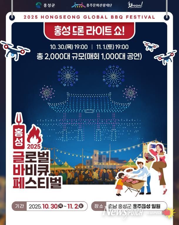뉴스펀치 김길룡 기자 | 홍성군은 오는 10월 30일과 11월 1일 저녁 7시, ‘2025 홍성 글로벌 바비큐 페스티벌’과 ‘홍성사랑 국화축제’를 주제로 한 2,000대 드론라이트 쇼를 선보인다고 밝혔다.