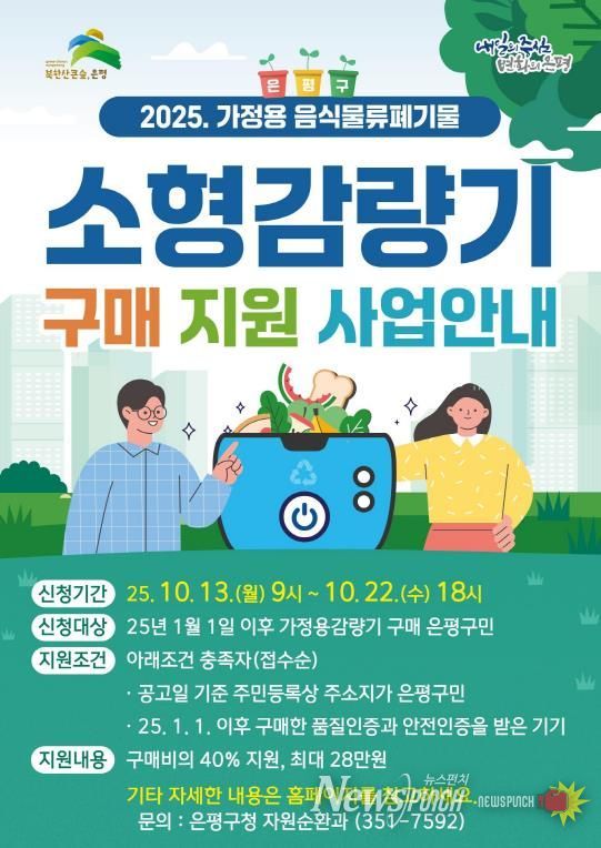 뉴스펀치 김완규 기자 | 서울 은평구는 음식물 제로웨이스트를 실천을 위해 ‘은평구 가정용 소형감량기 구매 2차 지원사업’ 신청자를 오는 13일부터 22일까지 모집한다고 밝혔다.