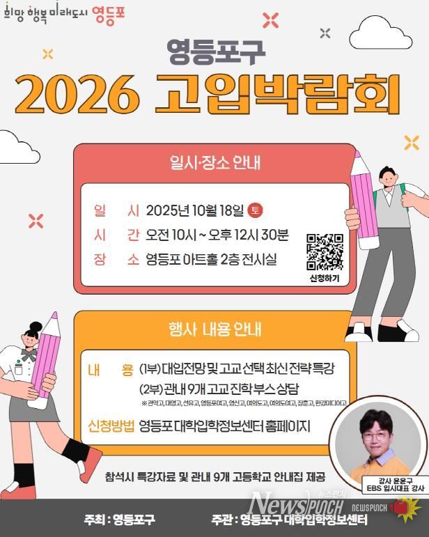 뉴스펀치 김완규 기자 | 영등포구가 10월 18일 오전 10시, 영등포 아트홀 전시실에서 중학생과 학부모를 위한 ‘2026학년도 고입박람회’를 연다고 밝혔다. 내달 시작되는 고입 원서접수를 앞두고 최선의 진학 선택을 돕기 위해 마련된 자리다.