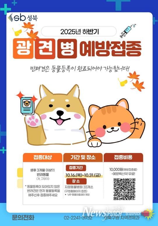 뉴스펀치 김완규 기자 | 서울 성북구가 10월 16일부터 31일까지 16일간 가을철 광견병 예방접종을 실시한다.