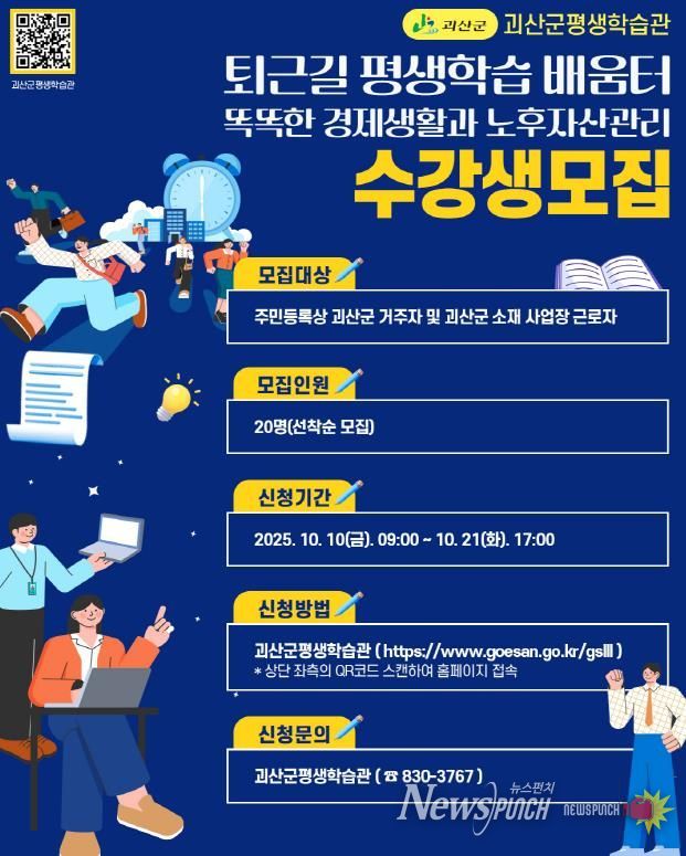 뉴스펀치 김길룡 기자 | 충북 괴산군은 10일부터 오는 21일까지 ‘2025년 괴산군 평생학습관 퇴근길 평생학습 배움터’ 수강생을 모집한다고 밝혔다.