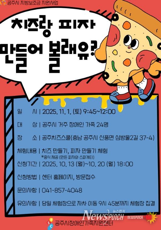 이번 프로그램은 오는 11월 1일 공주시 신풍면에 위치한 공주치즈스쿨에서 진행되며, 참여 가족들은 치즈와 피자를 직접 만들고 함께 나누어 먹으며 특별한 시간을 보낼 예정이다.