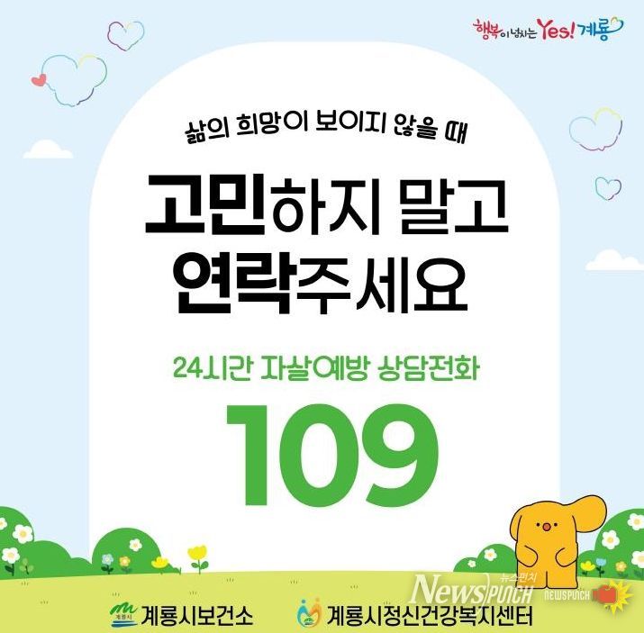뉴스펀치 김길룡 기자 | 계룡시는 ‘행복이 넘치는 Yes! 계룡’ 구현을 위해 건강하고 행복한 계룡시를 위한 다양한 자살 예방 사업을 펼치고 있다.