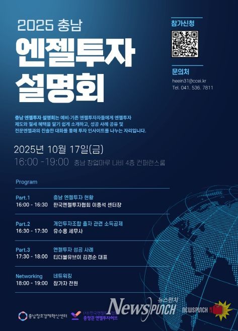 뉴스펀치 김길룡 기자 | (재)충남창조경제혁신센터는 도내 (예비)엔젤투자자 및 개인투자조합 출자자를 대상으로 ‘2025년 충남 엔젤투자 설명회’ 참가자를 모집한다고 밝혔다.