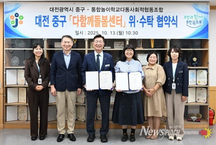 뉴스펀치 김길룡 기자 | 대전 중구는 13일 통합놀이학교다동 사회적협동조합(대표 이미라)과 다함께돌봄센터 석교1호점 위수탁 운영협약을 체결했다고 밝혔다.