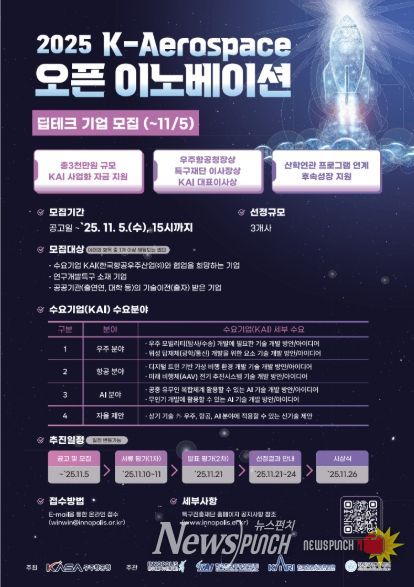뉴스펀치 조평훈 기자 | 우주항공청은 10월 13일 우주항공청이 주최하고 한국항공우주산업㈜, 연구개발특구진흥재단, 진주강소특구(경상대학교), 한국항공우주연구원이 주관하는 '2025 K-Aerospace 오픈 이노베이션'을 추진하여 딥테크 기업을 육성할 계획이라고 밝혔다.