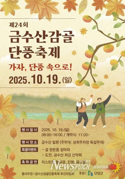 뉴스펀치 김길룡 기자 | 충북 단양군 적성면 금수산 일원에서 열리는 ‘제24회 금수산감골단풍축제’가 오는 19일 상학주차장 일원에서 열린다.