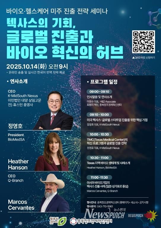 뉴스펀치 김길룡 기자 | 청주시와 충북창조경제혁신센터는 바이오분야 창업기업의 글로벌 진출을 지원하기 위해 14일 온라인 세미나 ‘텍사스의 기회 : 글로벌 진출과 바이오 혁신의 허브’를 개최했다.