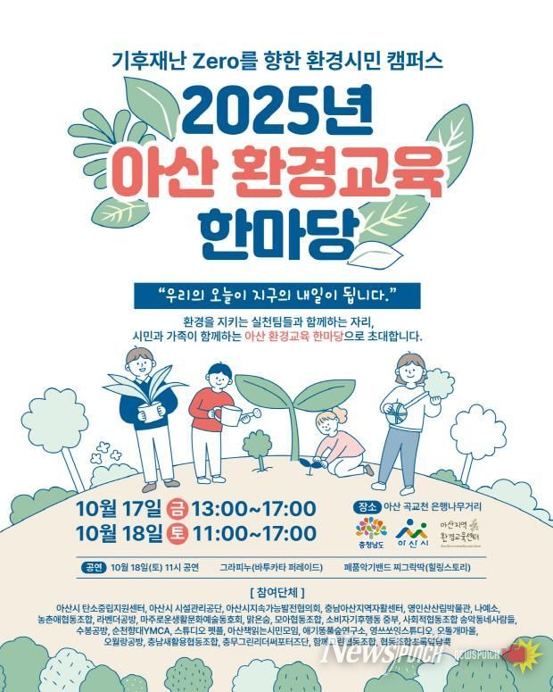 환경교육의 성과는 시민 축제로 이어지고 있다. 2022년 시작된 ‘환경교육 한마당’은 해마다 참여 규모를 넓히며 대표 시민참여형 행사로 자리 잡았다. 오는 10월 17~18일에는 곡교천 여해나루 일원에서 ‘기후재난 Zero를 향한 환경시민 캠퍼스’를 주제로 ‘2025 환경교육 한마당 및 탄소중립 실천 확산대회’가 열린다. 아산시와 교육지원청, 27개 협의체 기관이 공동 주관하는 이번 행사는 환경교육도시 지정을 향한 시의 의지와 성과를 공유하는 장이 될 전망이다.