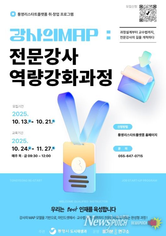 이상용 도시재생과장은 “이번 과정을 통해 다양한 분야의 전문강사들이 한층 더 성장할 수 있는 계기가 되기를 바란다”며 “통영시민과 통영시에서 활동하고 있는 강사들의 많은 관심과 참여를 바란다”고 전했다.