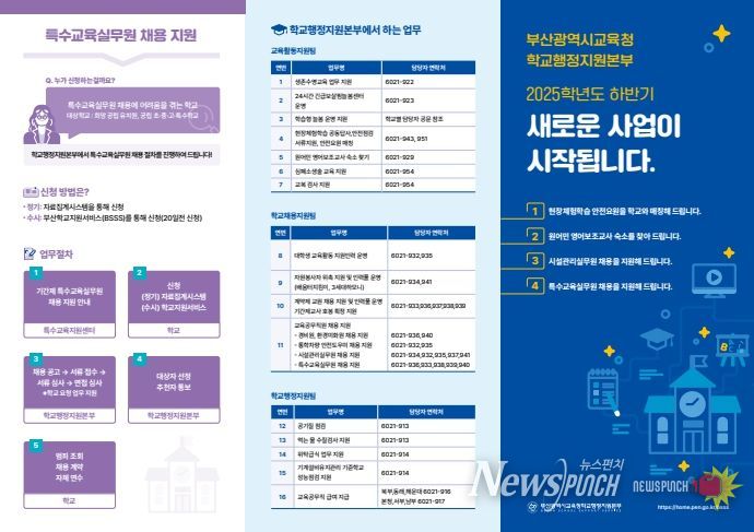 부산광역시교육청학교행정지원본부는 2025학년도 하반기부터 확대 시행되는 학교 지원 신규 사업 4가지를 소개하는 홍보 리플릿을 제작해 부산 관내 모든 학교에 배포한다고 14일 밝혔다.
