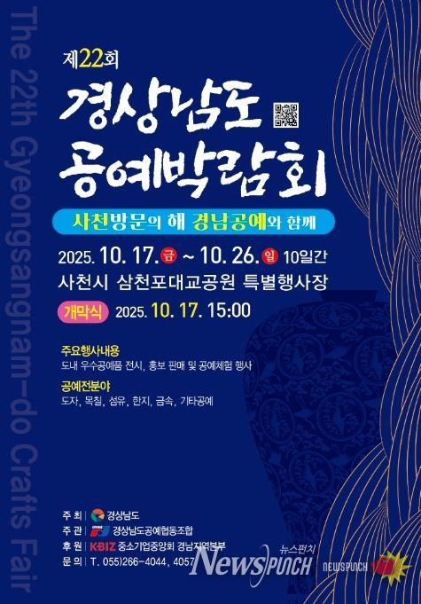 뉴스펀치 김길룡 기자 | 경상남도는 10월 17일부터 26일까지 10일간 사천시 삼천포대교공원 특별행사장에서 ‘제22회 경남 공예박람회’를 개최한다고 밝혔다.