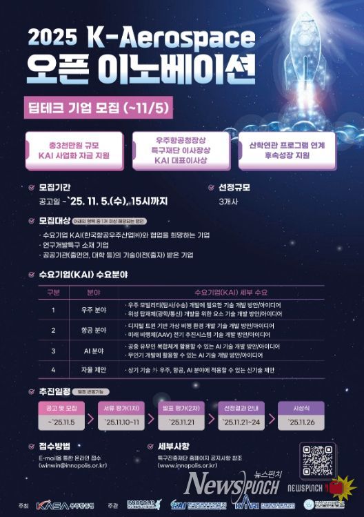 모집 대상은 수요기업인 KAI에서 제시한 4개 분야(우주·항공·AI, 자유)에서 KAI와 협업을 희망하는 기업으로, 서류 및 발표평가를 거쳐 최종 3개사를 선정할 예정이다.