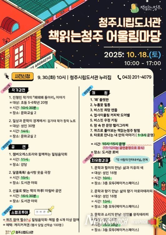 뉴스펀치 김길룡 기자 | 청주시립도서관은 오는 18일 오전 10시부터 오후 5시까지 도서관에서 책과 공연, 체험이 어우러진 독서문화축제 ‘어디든 책뜰’을 운영한다.