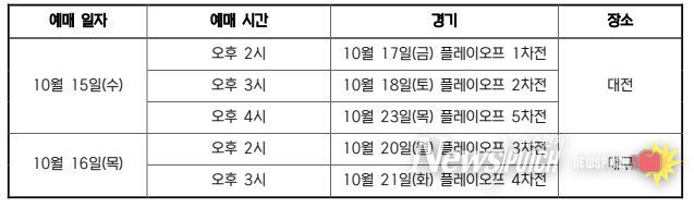 플레이오프 입장권은 포스트시즌 입장권 단독 판매사인 NOL 티켓 예매 홈페이지와 애플리케이션 그리고 NOL 티켓 고객센터(전화 1544-1555)를 통해 1인당 최대 4매까지 가능하다.