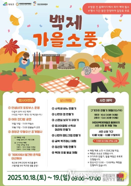 뉴스펀치 김길룡 기자 | 청양군은 오는 18일부터 19일까지 이틀간 백제문화체험박물관과 어린이백제체험관에서 ‘제5회 백제전통문화행사 백제 가을 소풍’을 개최한다.