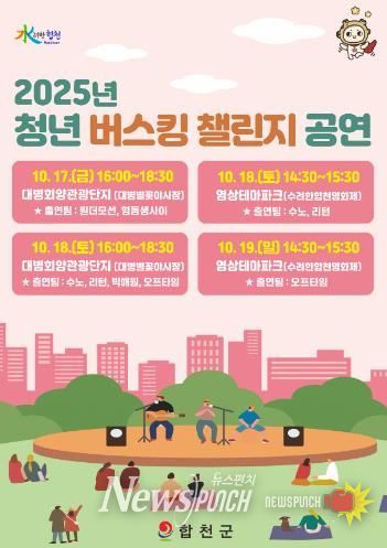 뉴스펀치 김길룡 기자 | 합천군은 10월 17일부터 19일까지 3일간 합천영상테마파크 및 대병면 회양관광단지 일원에서 청년 버스킹 챌린지 공연을 개최한다.