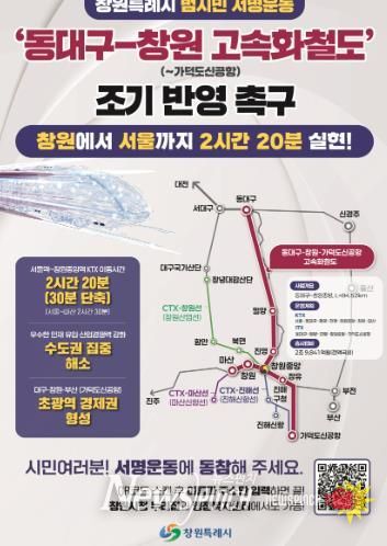 뉴스펀치 김길룡 기자 | 창원특례시는 ‘동대구-창원-가덕도신공항 고속화철도’의 ‘제5차 국가철도망 구축계획’ 반영을 촉구하기 위해 10월 17일부터 11월 16일까지 약 한 달간 ‘동대구-창원 고속화철도 조기 반영 촉구’ 범시민 서명운동을 전개한다.