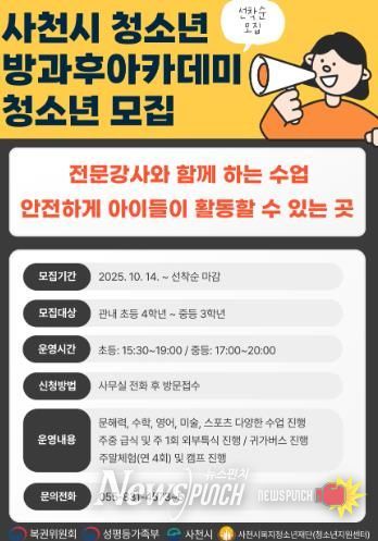 뉴스펀치 김길룡 기자 | 사천시 복지·청소년재단 소속 청소년방과후아카데미는 청소년의 안전한 방과 후 돌봄과 균형잡힌 성장을 지원하기 위해 신규 청소년을 모집한다고 15일 밝혔다.