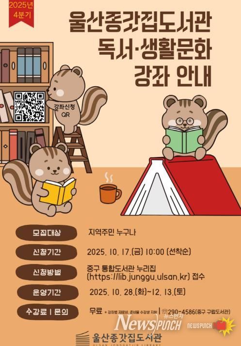 뉴스펀치 김길룡 기자 | 울산 중구에서 운영하는 울산종갓집도서관이 2025년 4분기 독서·생활문화강좌 수강생을 모집한다.