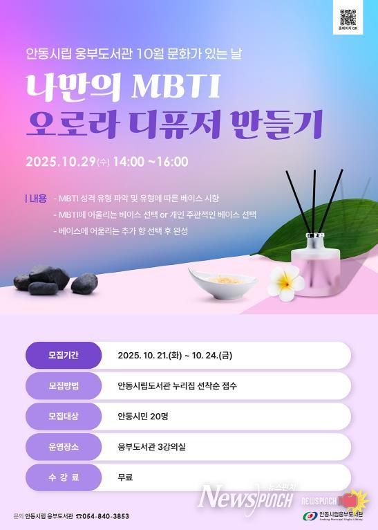 뉴스펀치 김길룡 기자 | 안동시립웅부도서관은 오는 10월 29일 14:00부터 16:00까지 ‘나만의 MBTI 오로라 디퓨저 만들기’ 원데이 클래스를 운영한다고 밝혔다.