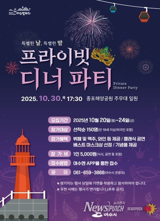 시 관계자는 “작년에 이어 올해도 이색적인 장소에서 시민과 관광객이 함께 낭만 밤바다를 즐길 수 있도록 프라이빗 디너 파티를 준비했다”며 “선선한 가을밤 여수의 매력과 낭만을 즐길 수 있는 이번 행사에 많은 관심과 참여를 바란다”고 전했다.