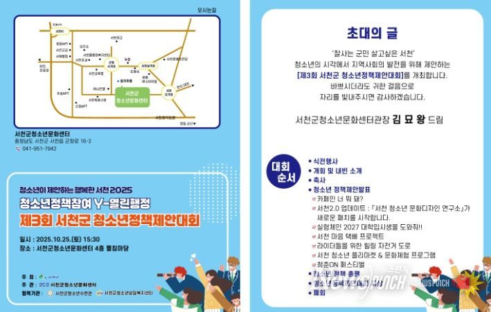 뉴스펀치 김길룡 기자 | 서천군청소년문화센터는 청소년들이 건강하고 행복한 삶을 꿈꾸는 지역사회에 대해 생각하고 청소년의 시각에서 서천군의 발전을 위한 정책을 제안하는 '제 3회 서천군 청소년정책제안대회'를 오는 10월 25일에 개최한다.