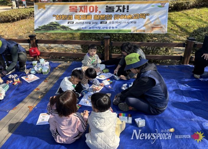 뉴스펀치 김길룡 기자 | 논산시는 20일 논산시민가족공원 일원에서 지역 어린이집 아동 20여 명을 대상으로 국산 목재를 활용한 ‘유아숲교육 프로그램’을 운영했다고 밝혔다.