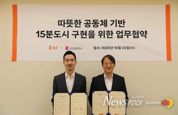 뉴스펀치 김길룡 기자 | 부산시는 22일 오후 2시 10분 서울 ㈜당근마켓 본사에서 ㈜당근마켓(대표이사 황도연)과 '따뜻한 공동체 기반 15분도시 구현을 위한 업무협약'을 체결했다고 밝혔다.
