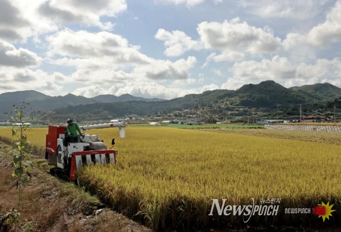 뉴스펀치 김길룡 기자 | 한낮의 햇살이 따뜻하게 느껴지는 완연한 가을에 접어든 23일, 충북 괴산군 문광면 일대 한 논에서 가을장마를 뒤로 하고 바삐 움직이는 콤바인이 영근 벼 수확에 한창이다.