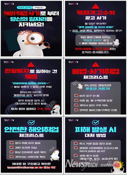 뉴스펀치 김길룡 기자 | 부산시는 최근 캄보디아, 베트남 등 일부 국가에서 고수익을 미끼로 한 해외취업 사기 피해가 잇따르자, 청년층의 피해를 예방하기 위해 '해외취업 범죄 피해 예방 교육'을 추진한다고 밝혔다.