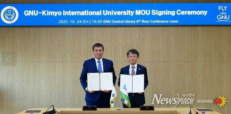 뉴스펀치 김길룡 기자 | 경상국립대학교는 10월 24일 가좌캠퍼스 도서관 6층 회의실에서 우즈베키스탄 기묘국제대학(KIUT, Kimyo International University)과 학술·학생 교류에 관한 협정을 체결했다.